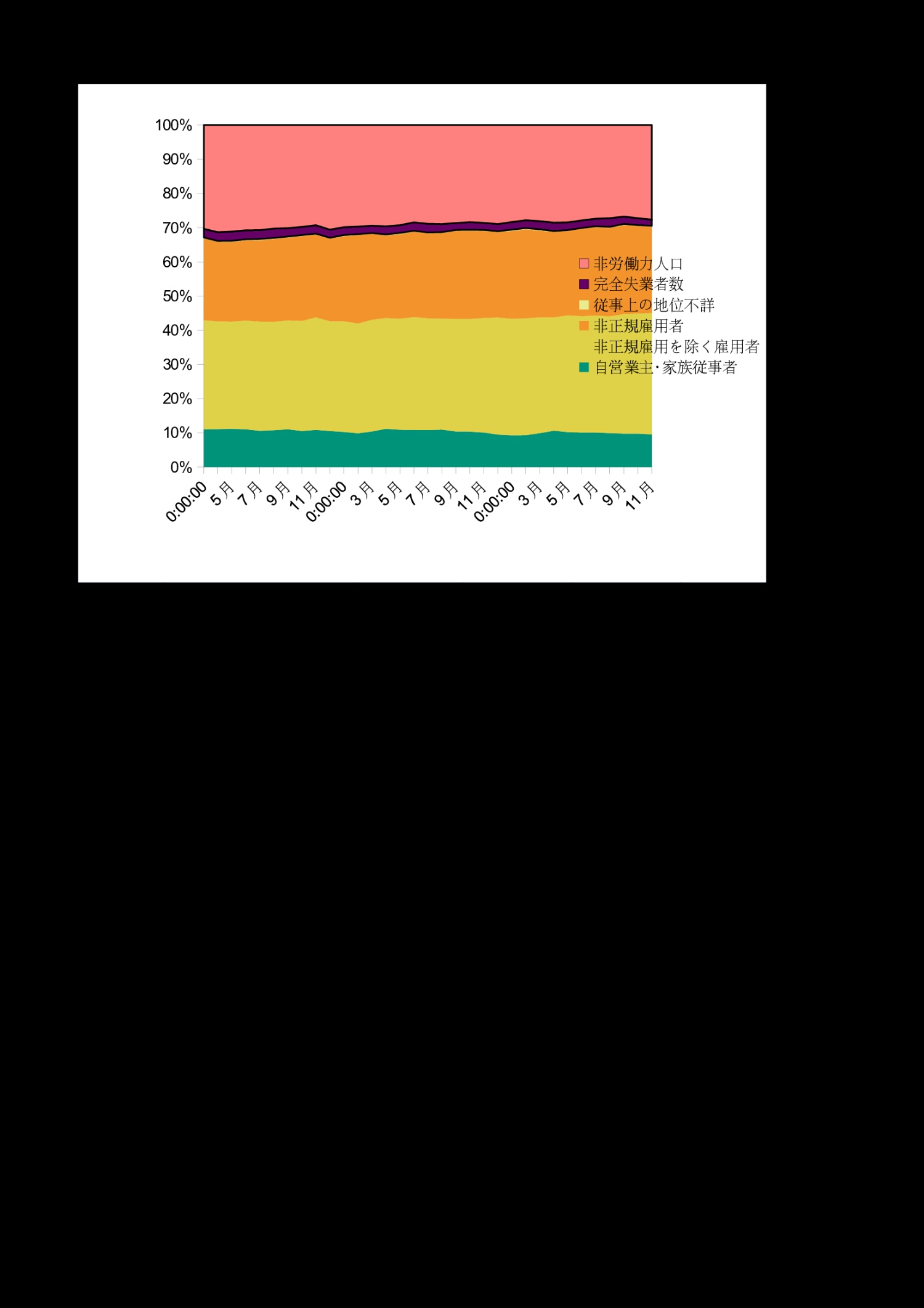 | 月 | 自営業主・家族従事者 | 非正規雇用を除く雇用者 | 非正規雇用者 | 従事上の地位不詳 | 完全失業者数 | 非労働力人口 |