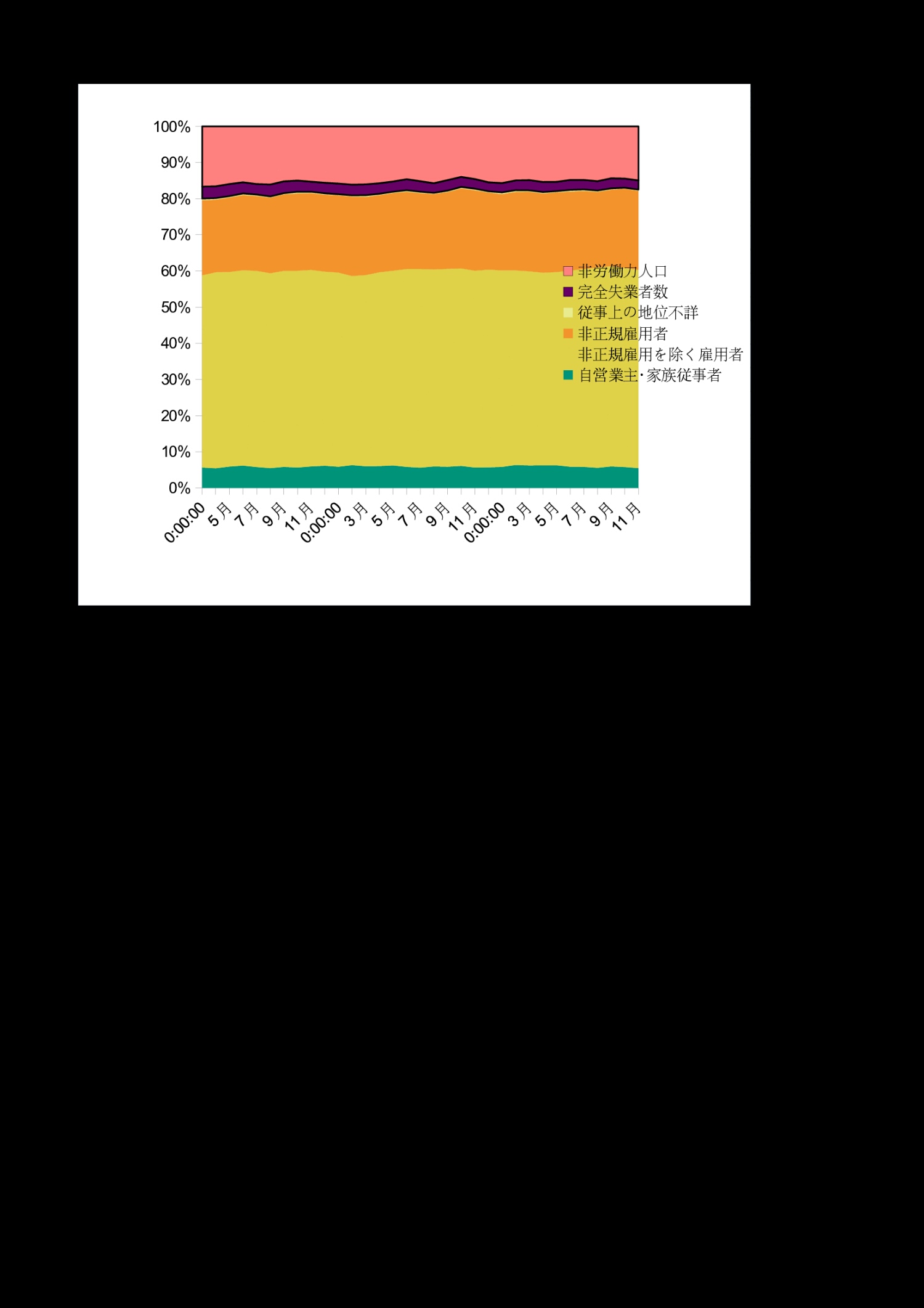 | 月 | 自営業主・家族従事者 | 非正規雇用を除く雇用者 | 非正規雇用者 | 従事上の地位不詳 | 完全失業者数 | 非労働力人口 |